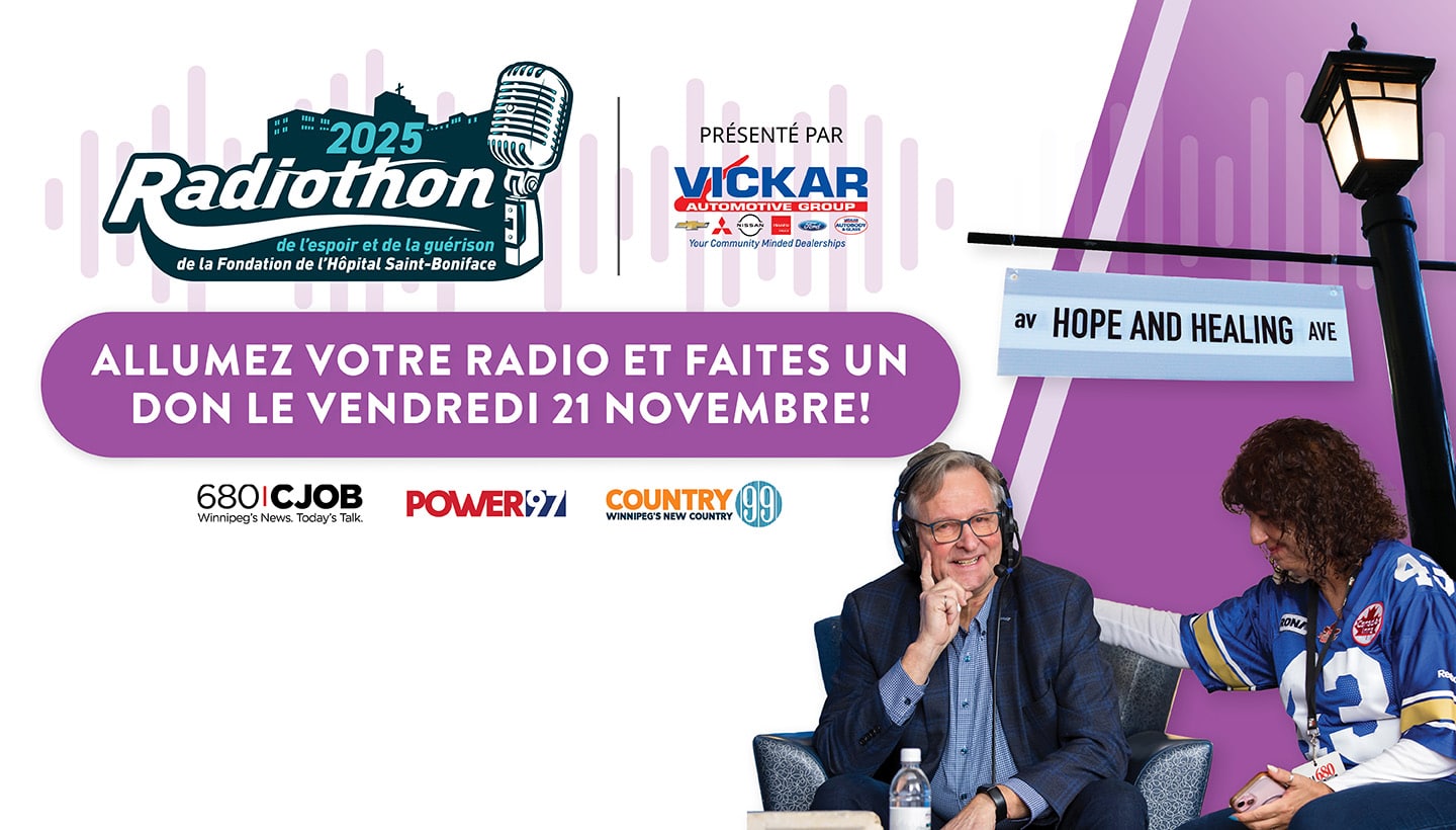 Retenez bien la date! Le Radiothon revient le vendredi 21 novembre 2025. Syntonisez le 680CJOB toute la journée pour entendre des récits inspirants et soutenir l’Hôpital Saint-Boniface. Vous entendrez des personnes dont la vie a été sauvée, des héroïnes et des héros de la santé qui incarnent l’esprit de compassion, et des chercheuses et chercheurs médicaux de calibre mondial qui sont en quête des remèdes de demain. Écoutez et apprenez comment vous pouvez influer positivement sur la santé de notre collectivité. Vous pouvez aussi vous joindre à nous en personne en nous rendant visite à l’Atrium Everett et à la Galerie Buhler de l’Hôpital Saint-Boniface.