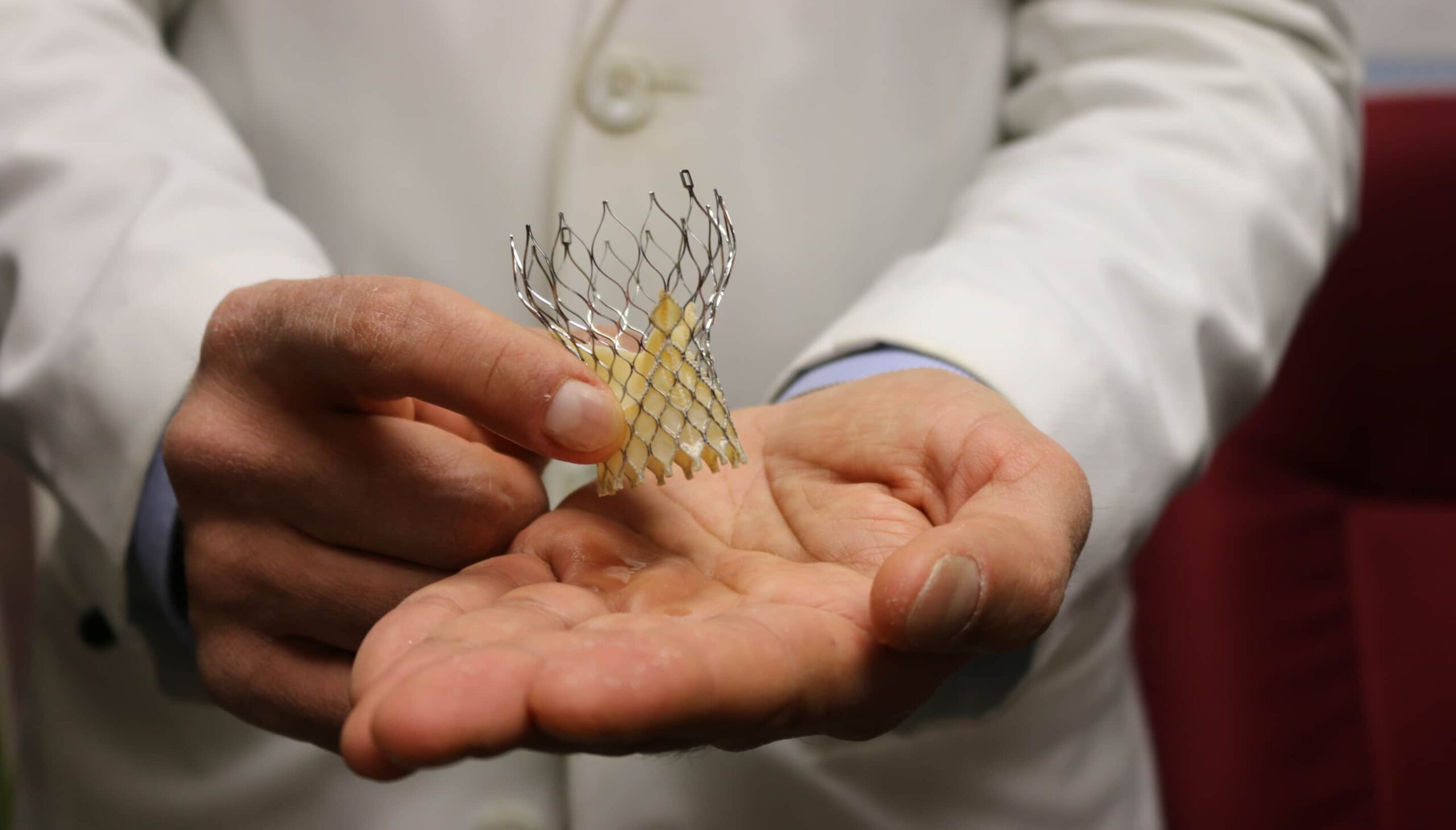 Le Dr Malek Kass, cardiologue et directeur médical du programme d’ITVA, tenant une valve artificielle.
