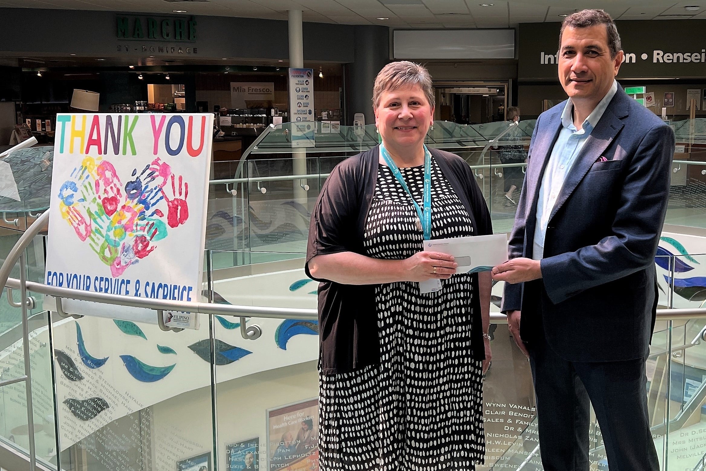 Le Dr Yasser El-Sayed (à droite) reçoit les honoraires du prix Duhamel des mains de Karen Fowler, présidente-directrice générale de la Fondation de l’Hôpital Saint-Boniface.
