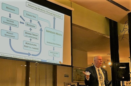 Durant la présentation, le Dr Pierce a expliqué comment les recherches faites au CCRASM ont permis de déterminer comment l’une des principales cultures de la région, le lin, joue un rôle important pour réduire les risques de maladie du cœur. Par la même occasion, il a parlé des retombées économiques dans les secteurs de la santé, de l’agriculture et de l’agroalimentaire liées à l’utilisation du lin pour réduire l’impact des maladies cardiovasculaires.