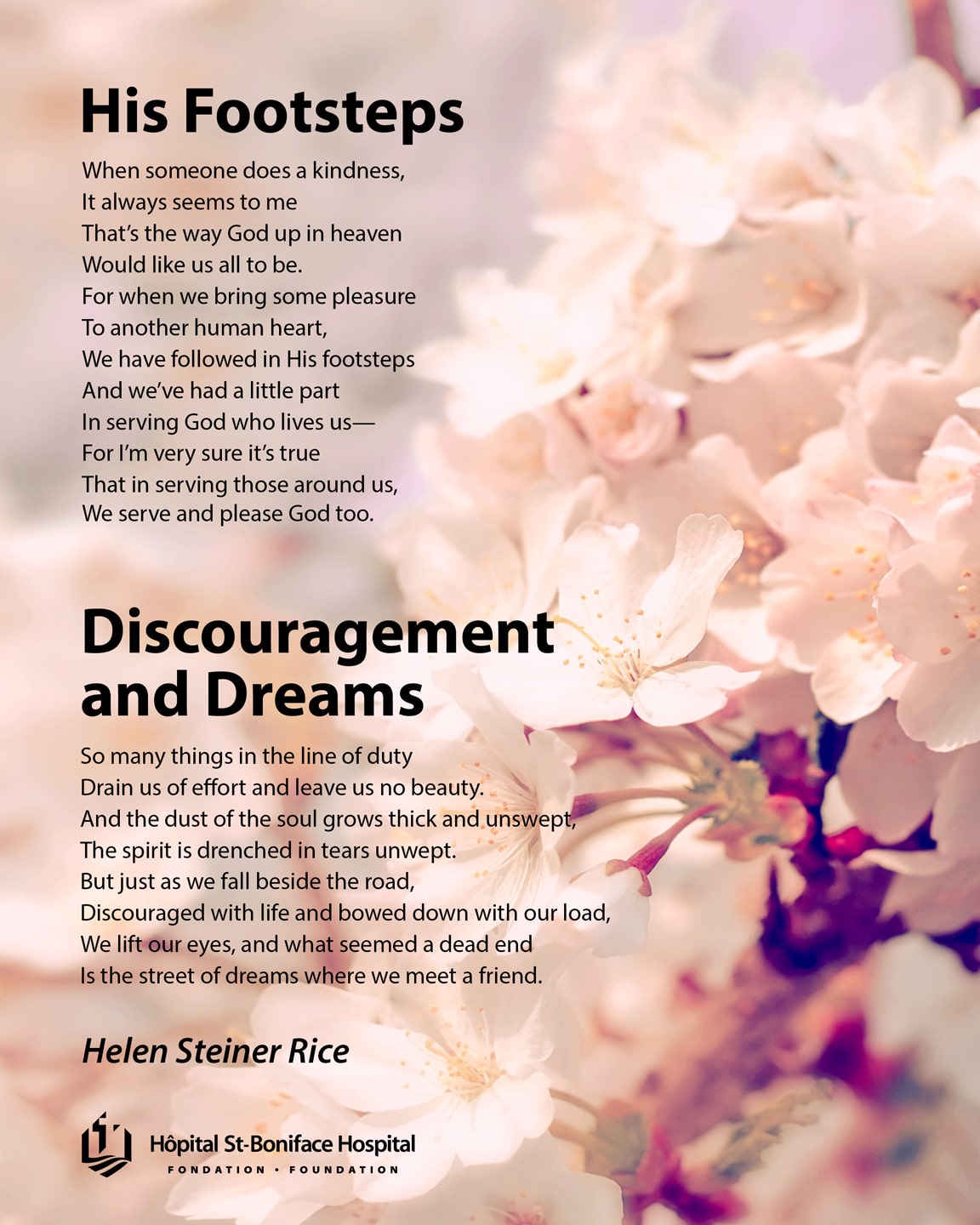 Nous voyons cette générosité en action de la part de nos donateurs annuels, qui transmettent leurs bons mots à nos héros locaux. La Fondation a reçu une lettre comportant deux poèmes écrits par Helen Steiner Rice, de la part de nos donateurs annuels. Nous espérons que ces poèmes encourageront tous les professionnels de la santé de l’Hôpital Saint-Boniface pendant cette période difficile. N’hésitez pas à les faire suivre.