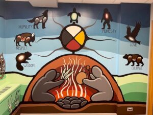 “We commissioned Justine to paint a mural that incorporates Indigenous spirituality and represents the three main Indigenous cultural groups (First Nation, Métis and Inuit) and have added Indigenous themed décor and natural elements to contribute to the healing atmosphere of the space,” said Murray.