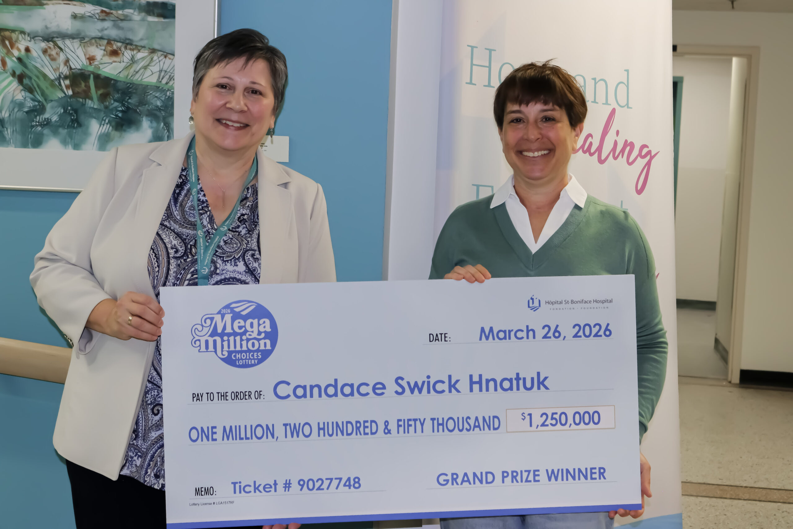 The call came from St. Boniface Hospital Foundation President and CEO Karen Fowler, informing Candace Swick Hnatuk that she was the grand prize winner of this year’s St. B Mega Million Choices Lottery, a win that awarded Swick Hnatuk and her husband a $1.25‑million, tax‑free cash payout.