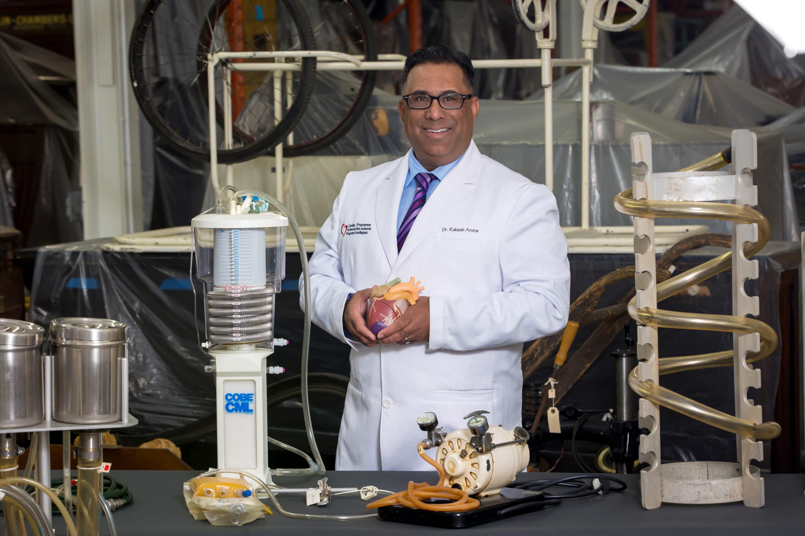 Dr. Rakesh Arora, head of cardiac surgery at St. Boniface Hospital, with the original equipment used by Dr. Morley Cohen in 1959. Courtesy of St. Boniface Museum.