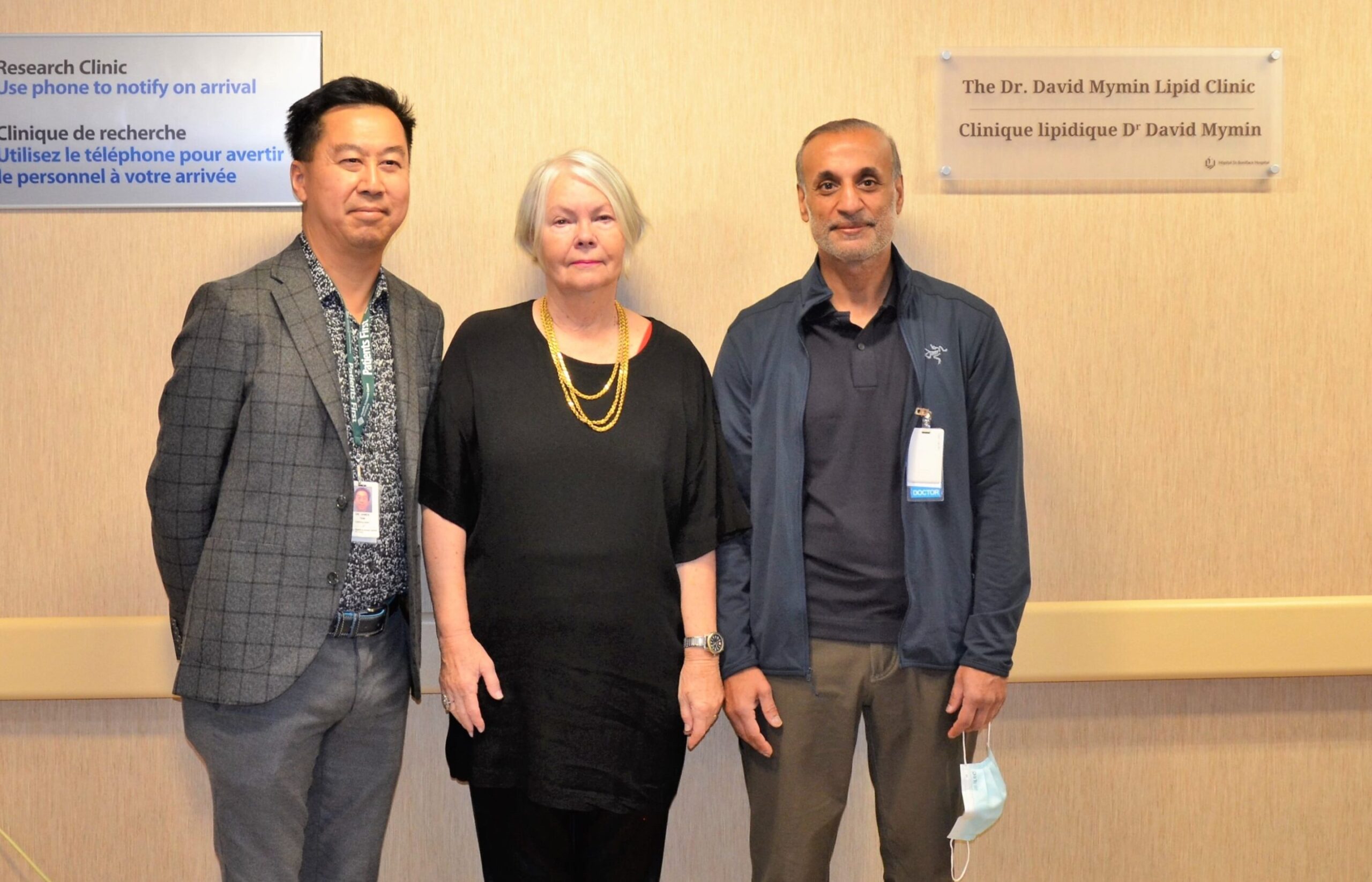 Pictured, left to right: Dr. James Tam, Maryse Myman, and Dr. Asad Junaid at the dedication ceremony for the Dr. David Mymin Lipid Clinic on October 20, 2022.