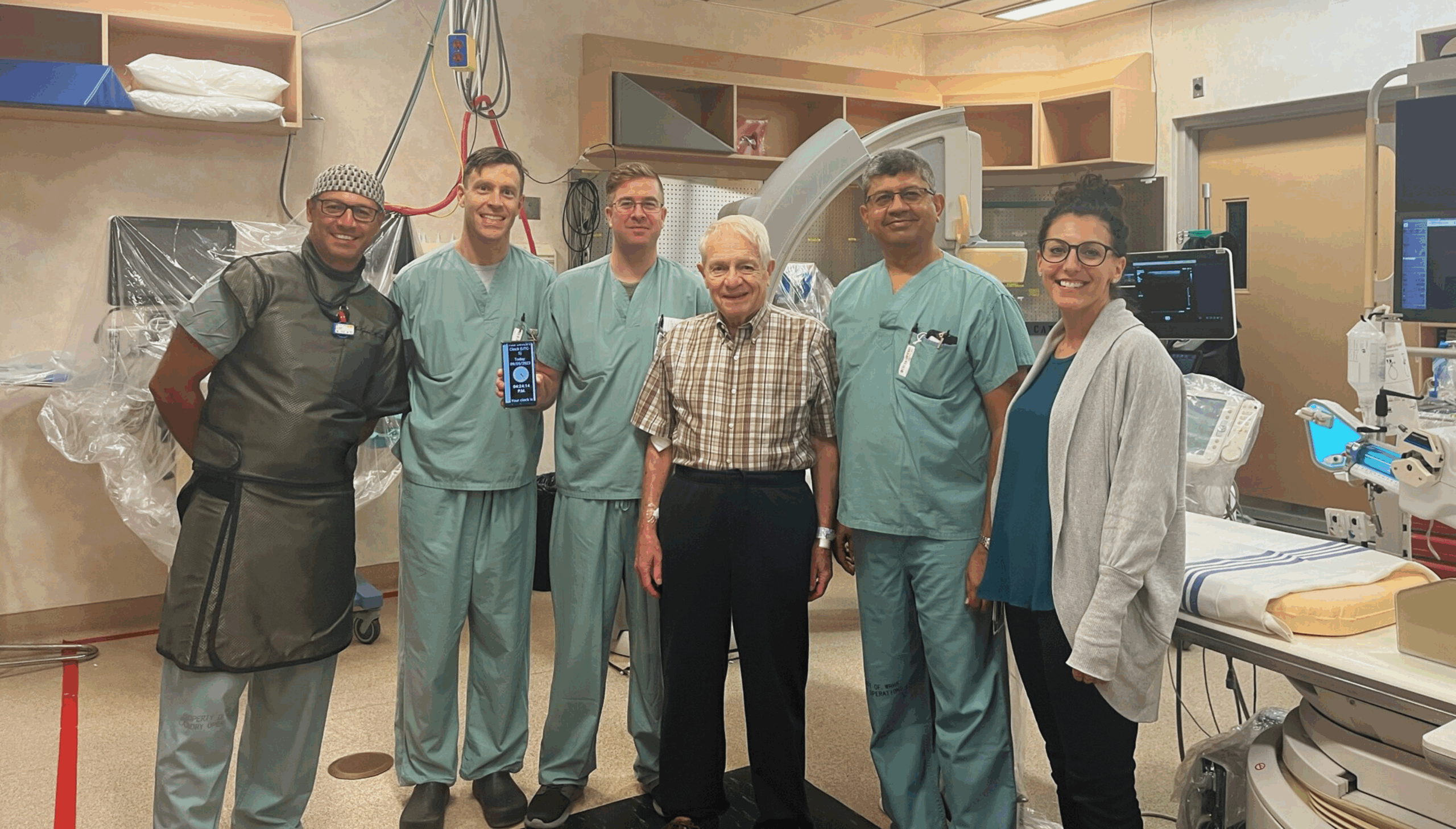Featured photo, from left: Dr. Malek Kass, Interventional Cardiologist; Dr. David Allen, Interventional Cardiologist; Dr. Aaron Spooner, Cardiac Surgeon; Albert J. McMurdie; Dr. Ashish Shah, Interventional Cardiologist; Emily Phillips, Clinical Nurse Specialist.