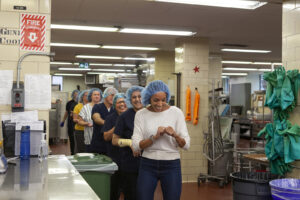 Moving through the Kitchen to the second station, the spectators watched staff work in real time on the tray line, where the food is prepared for delivery throughout the facility.